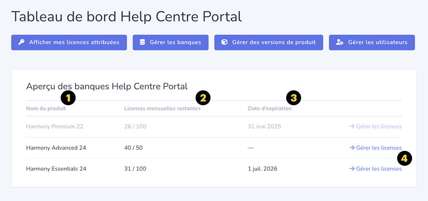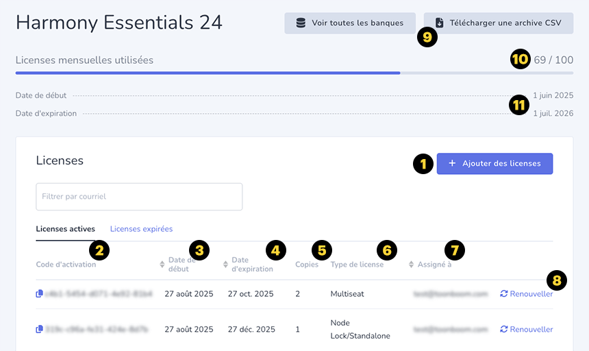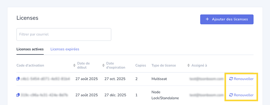 Cette page vous permet de suivre les utilisateurs auxquels des licences ont été attribuées et d'afficher des détails clés tels que les dates de début, les dates d'expiration et les types de licence. C'est également ici que les administrateurs peuvent générer de nouvelles licences ou renouveler les licences existantes.