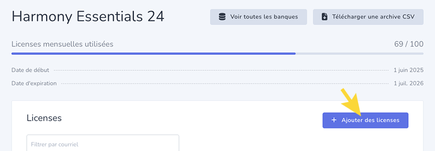 - Cliquez sur le bouton Ajouter des licences dans la page Gérer les licences.