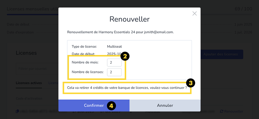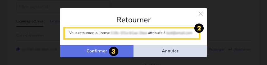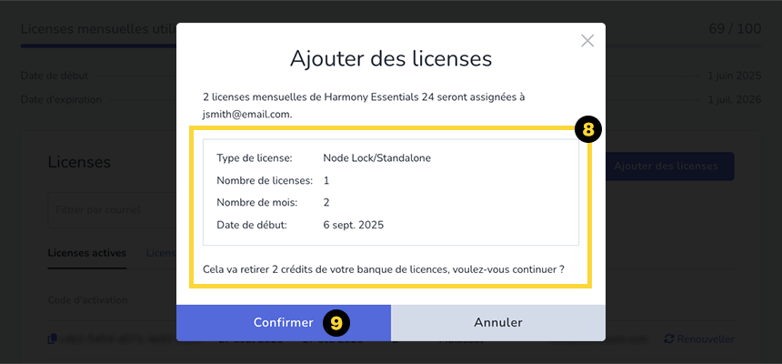 - Vérifiez le code d'activation de la licence et l'adresse courriel de l'utilisateur.