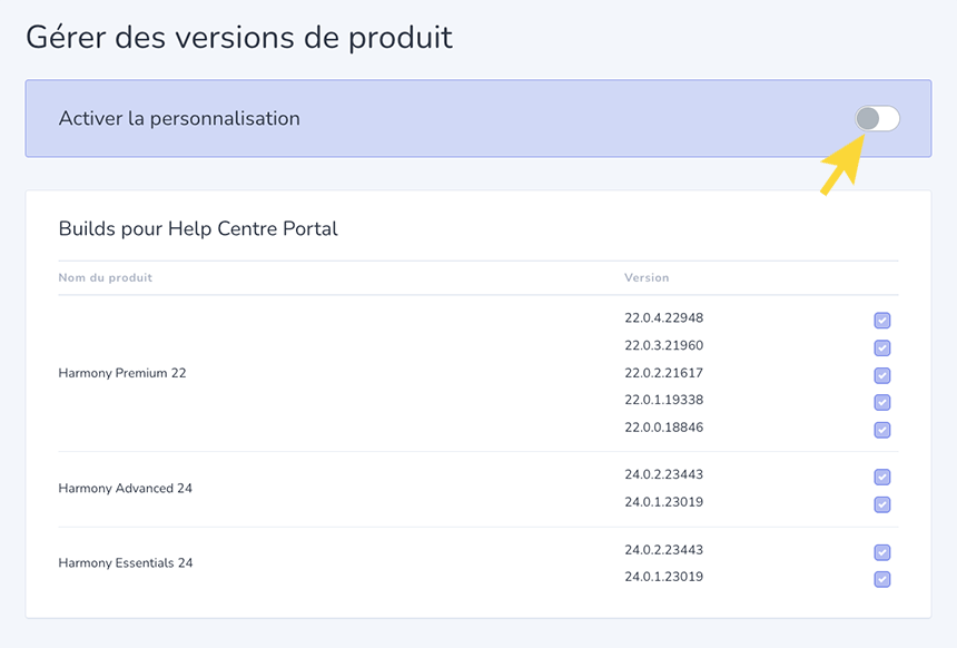 Cette page permet aux administrateurs de contrôler quelles versions des produits Toon Boom sont disponibles pour leurs équipes. Les options de personnalisation vous permettent de restreindre l'accès à des versions spécifiques si nécessaire.