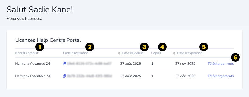 - Date de début (date à laquelle la licence devient disponible pour l'activation)