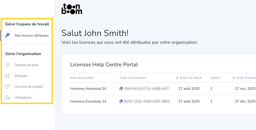 Le portail de licences d'entreprise Toon Boom (ELP) est une plateforme web permettant aux organisations de visualiser et de gérer les licences Harmony et Storyboard Pro Flex. Avec le ELP, vous pouvez facilement activer, suivre et renouveler les licences, ainsi qu'ajouter des utilisateurs et assigner des licences à votre équipe.