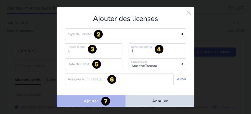 Suivez ces étapes pour générer de nouvelles licences et les attribuer aux utilisateurs. Cela permet de s'assurer que les licences sont correctement configurées avec le type, la durée et les détails du destinataire appropriés.