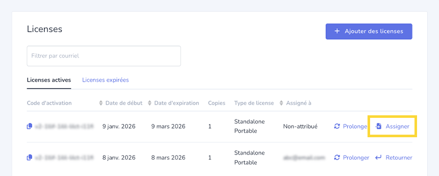 - Cliquez sur le lien Assigner dans la page Gérer les licences.