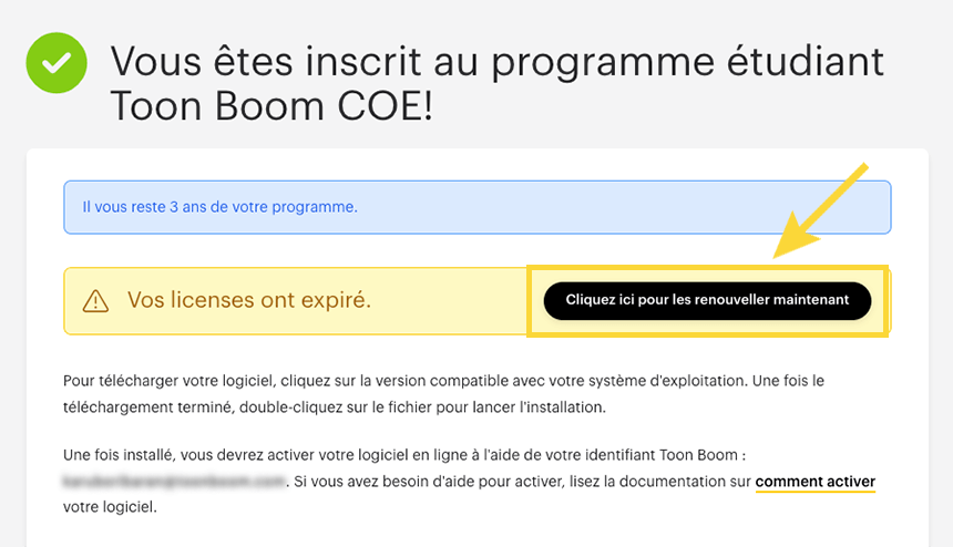 Si vous avez prolongé vos études, cela signifie que votre statut devra être prolongé manuellement par l'équipe de soutien de Toon Boom. Veuillez contacter l'équipe de soutien de Toon Boom et fournir les détails de votre situation - Comment puis-je contacter le service d'assistance de Toon Boom ?.