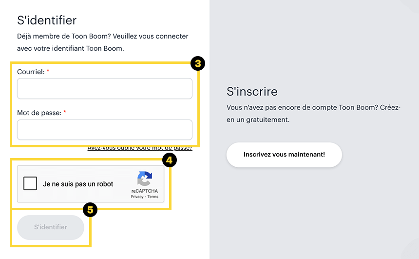 - Sous la première section, appuyez sur le bouton Commencer la session. Vous serez dirigé vers la page de connexion de Toon Boom.