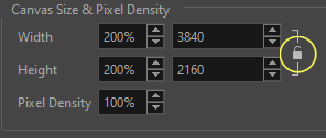 Canvas Size: Dans cette section, vous pouvez choisir la taille de votre toile bitmap en modifiant soit le pourcentage de la résolution du projet, soit la quantité de pixels. En cliquant sur l'icône de verrouillage, les valeurs seront dissociées et vous pourrez les modifier indépendamment.