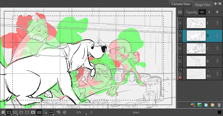 Par défaut, Storyboard Pro affiche le dessin en «onion skin» à sa pleine opacité. Cela peut rendre son utilisation peu pratique si vous avez déjà rempli de couleur votre dessin, car les poses précédentes et suivantes apparaîtront comme des formes opaques. Cet article vous montrera comment ajuster les paramètres de votre «onion skin» pour que vous puissiez l'utiliser sans obstruction.