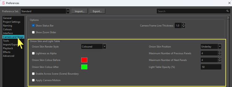 Dans la fenêtre «Preferences», sélectionnez l’onglet «Camera and Stage» et localisez la section «Onion Skin and Light Table»: