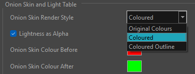Changer le paramètre «Onion Skin Render Style» affecte l'affichage du «onion skin». Sélectionnez l'un des éléments suivants dans la liste déroulante «Onion Skin Render Style» :