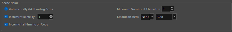 - Resolution Suffix: Si une scène doit être créée entre deux scènes séquentielles, un suffixe sera nécessaire car elle portera le même nom que l'une des scènes existantes.Le premier menu déroulant vous permet de choisir le séparateur entre le nom et le numéro suivant.La deuxième liste déroulante indique le caractère qui sera utilisé pour la numérotation. Il peut s'agir de chiffres ou de lettres.