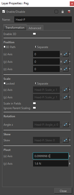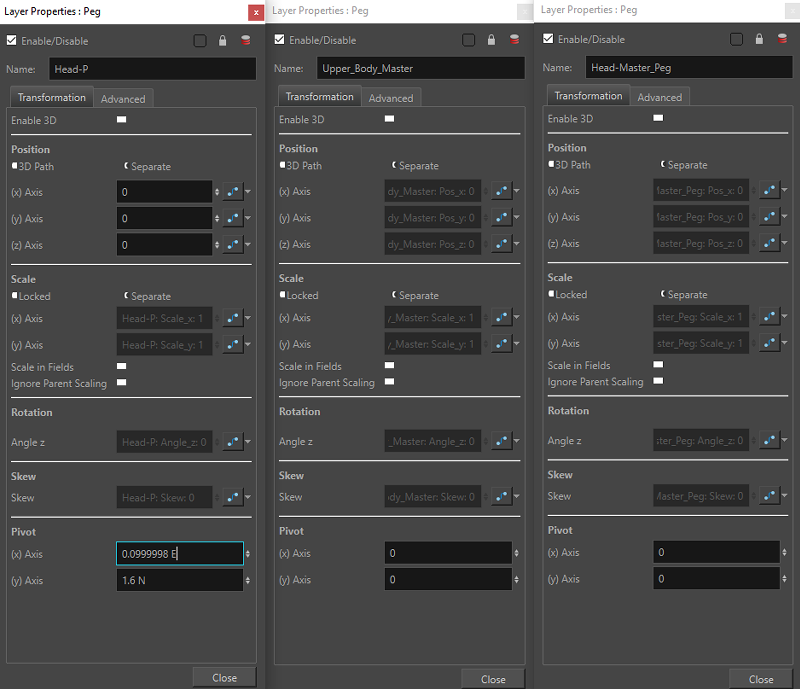 À l'aide de la fonction copier-coller, sélectionnez les coordonnées du «peg» que vous souhaitez utiliser comme position pivot, copiez-les et collez-les dans les mêmes champs des fenêtres «Layer Properties» des autres «pegs». Veillez à effectuer cette opération pour les coordonnées des axes x et y.
