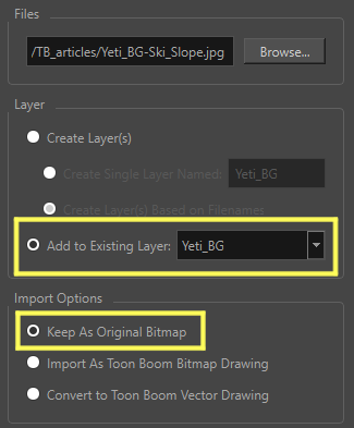 - Dans la fenêtre «Import Images», assurez-vous que l’option «Keep As Original Bitmap» dans la section «Import Options» est sélectionnée et choisir «Add to Existing Layer» dans la section «Layer», pour ajouter une image à un calque bitmap existant en tant que nouvelle substitution de dessin.