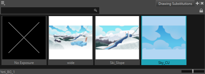 - Dans la vue «Library», consultez la section «Drawing Substitution». Vous pouvez également visionner celles ci dans la vue «Drawing Substitutions», tous les différents dessins disponibles pour l'arrière-plan peuvent être visualisés. Ils seront étiquetés de la même manière que le nom du fichier source.