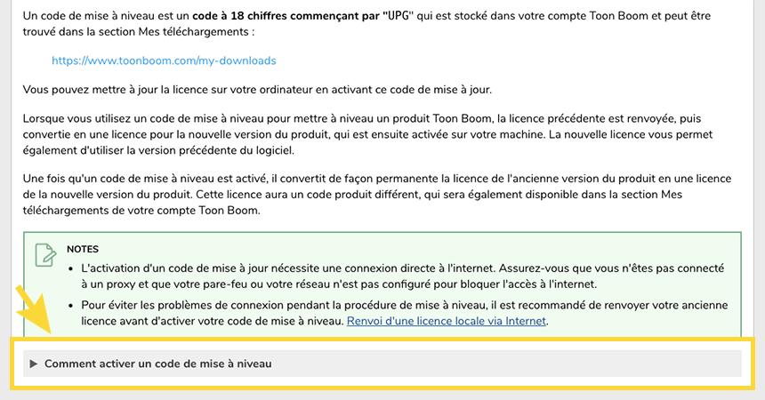 - Allez à la section Mise à niveau d'une licence du site de documentation des produits Toon Boom.