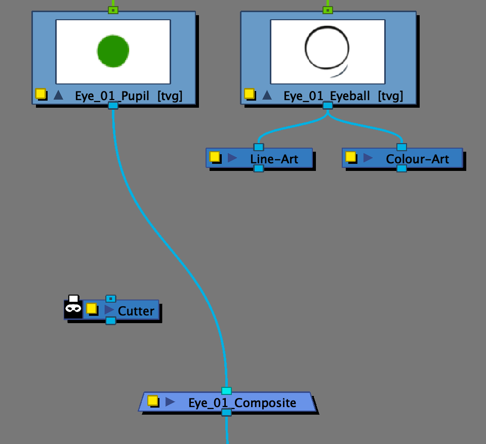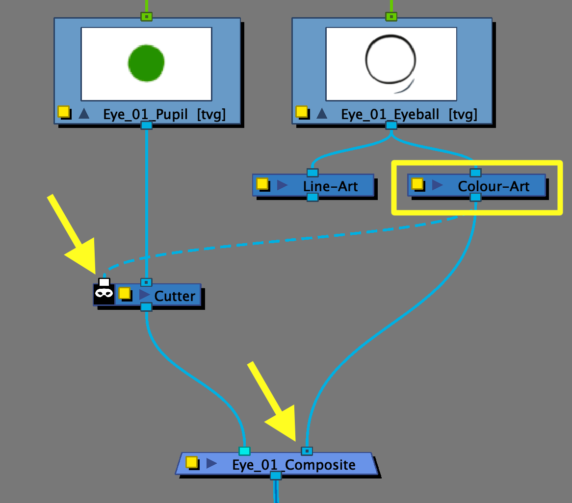 - Placez les nœuds «Line-Art» et «Colour-Art» sous le calque «Eye» et tirez une connection vers ceux-ci. Supprimez la connexion principale du calque «Eye» afin que «Pupil» soit le seul élément attaché.