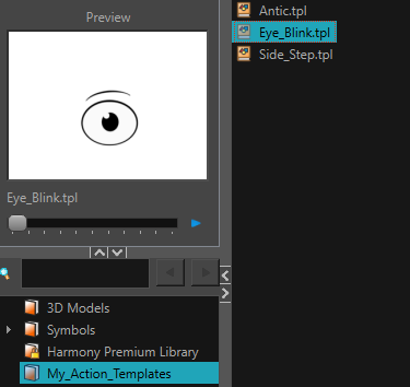 Un «action template» est un type de «template» qui est enregistré dans la vue «Library» d’Harmony. Il est défini comme un «action template» par ce qui est enregistré dans la vue «Library», et la manière dont il est utilisé, sinon il est comme n'importe quel autre «template» de en termes de format.