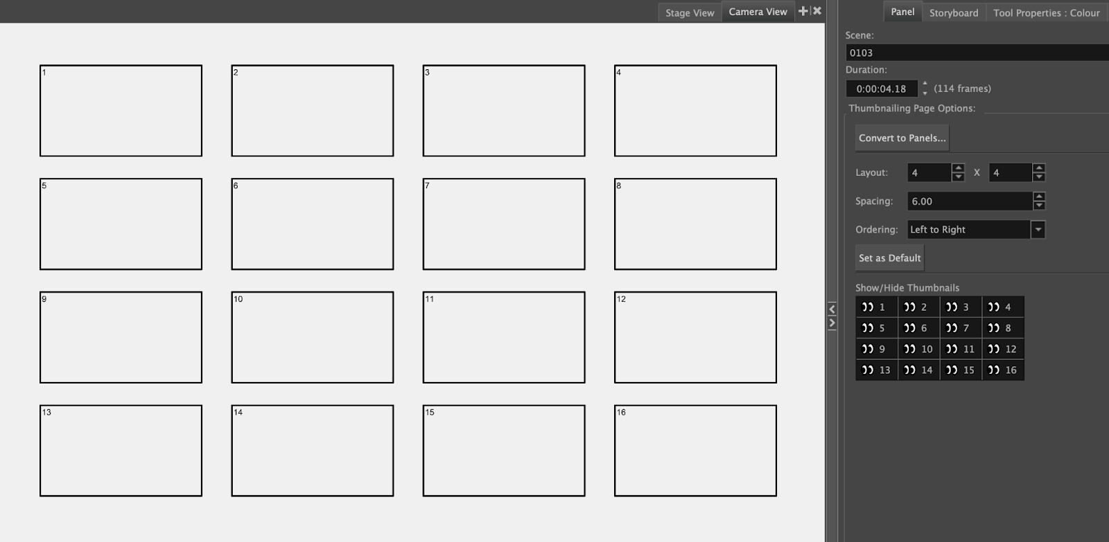 Si vous utilisez Storyboard Pro 25 ou une version ultérieure, cela peut être facilement réalisé en ajoutant une page « thumbnailing » ou vignettes.