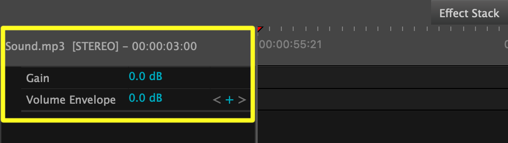 - Dans la partie gauche de la vue « Effect Stack », vous verrez le nom du clip audio et les sections pour les options « Gain » et « Volume Envelope ».
