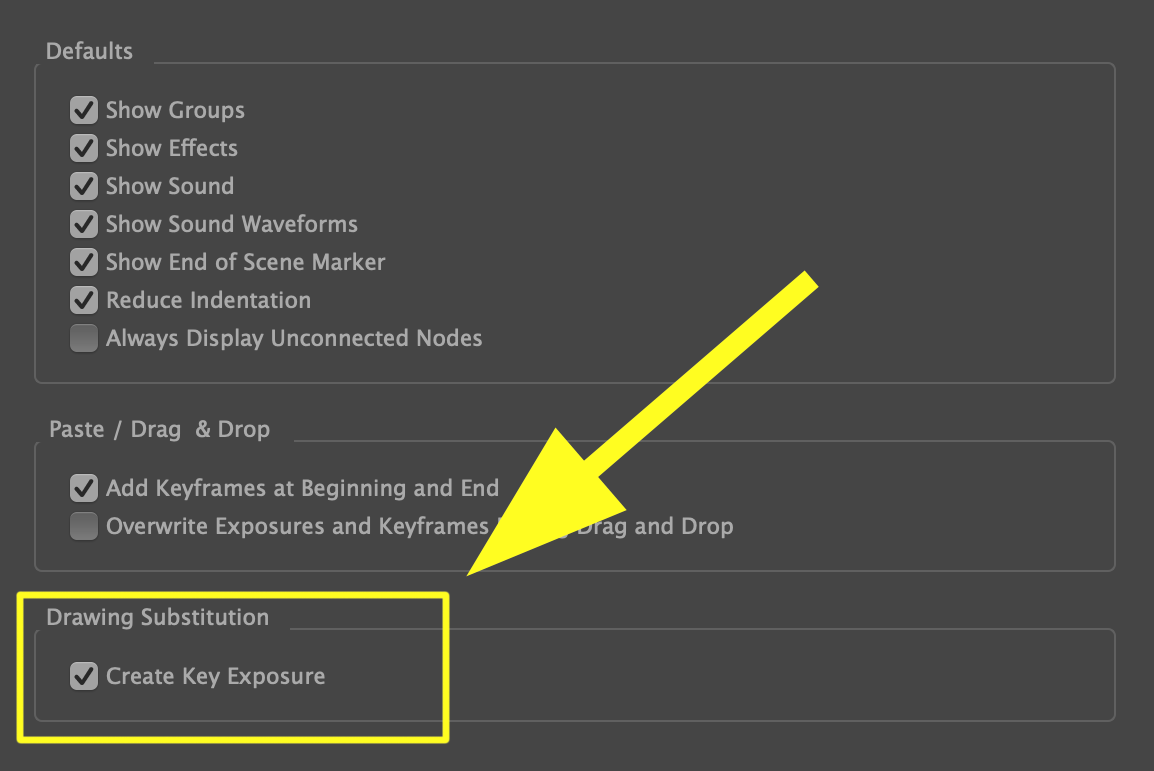 - Dans l’onglet « Timeline », sous la section « Drawing Substitution », cochez la case à côté de « Create Key Exposure ».