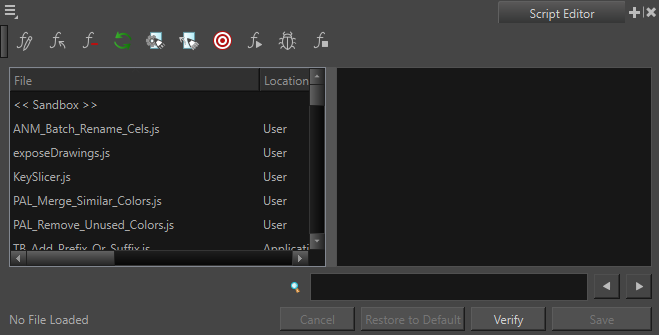 - Dans la barre d’outils «Script Editor» , sélectionnez le bouton «Import Script»