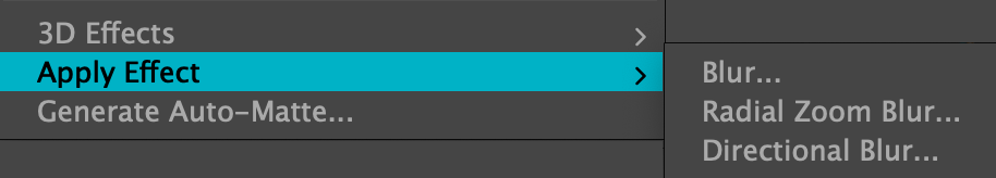 Les effets du menu Calque comprennent les éléments suivants : « Blur, Radial Zoom Blur, et Directional Blur ». Cliquez sur le nom de chaque flou pour voir ses paramètres.