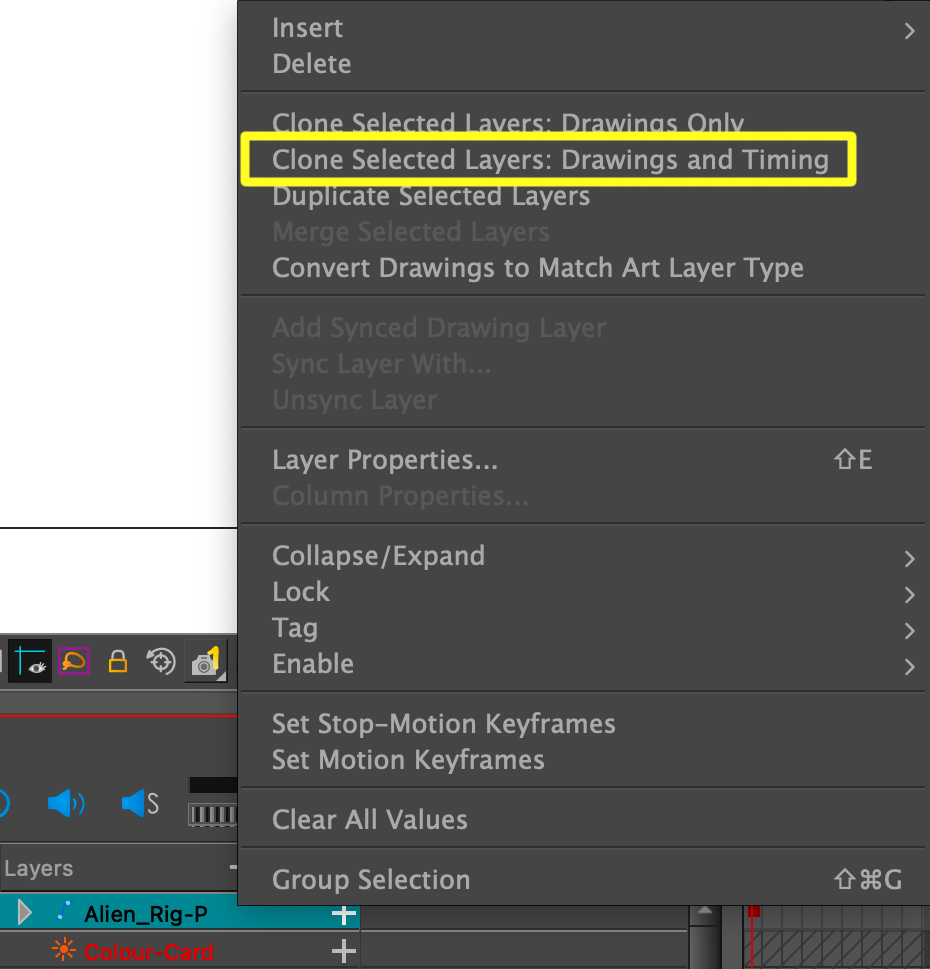1. Cliquez avec le bouton droit sur le calque et sélectionnez «Clone Selected Layers: Drawings and Timing». Cela garantira que le mouvement des clés d’animation et le timing des dessins seront liés et mis à jour avec l'original.