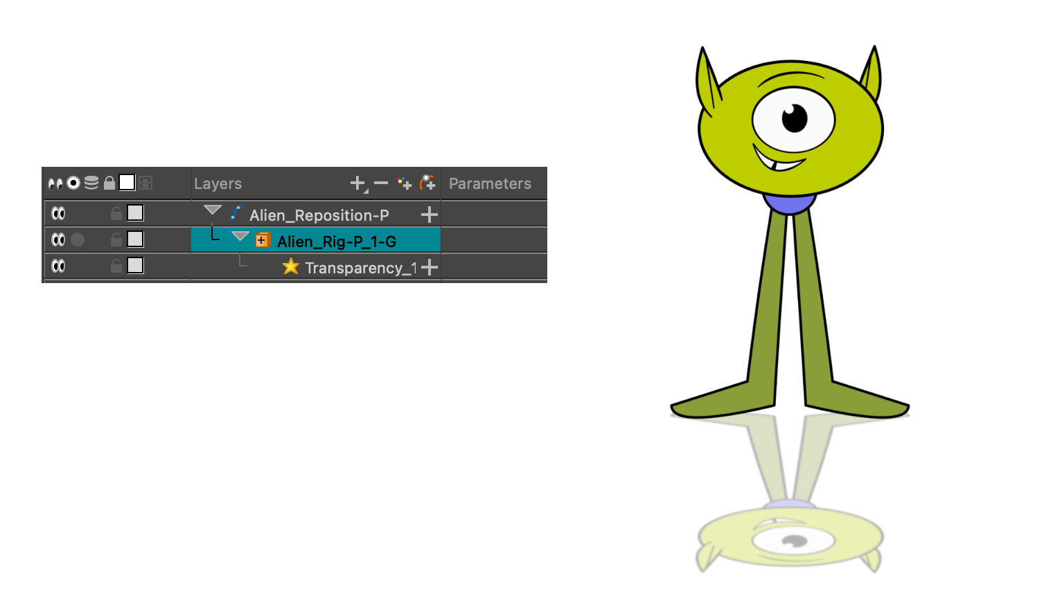 • Êtes-vous en train de copier un rig? Assurez-vous qu'il se referme en un seul calque de type «peg», car cela facilite la copie.