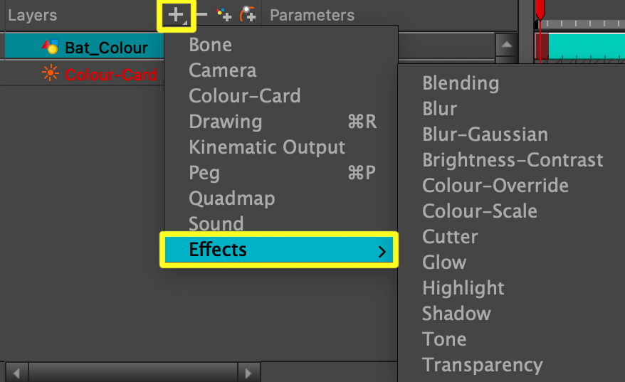 - Dans le menu déroulant + de la section « Layers » de la vue « Timeline ».