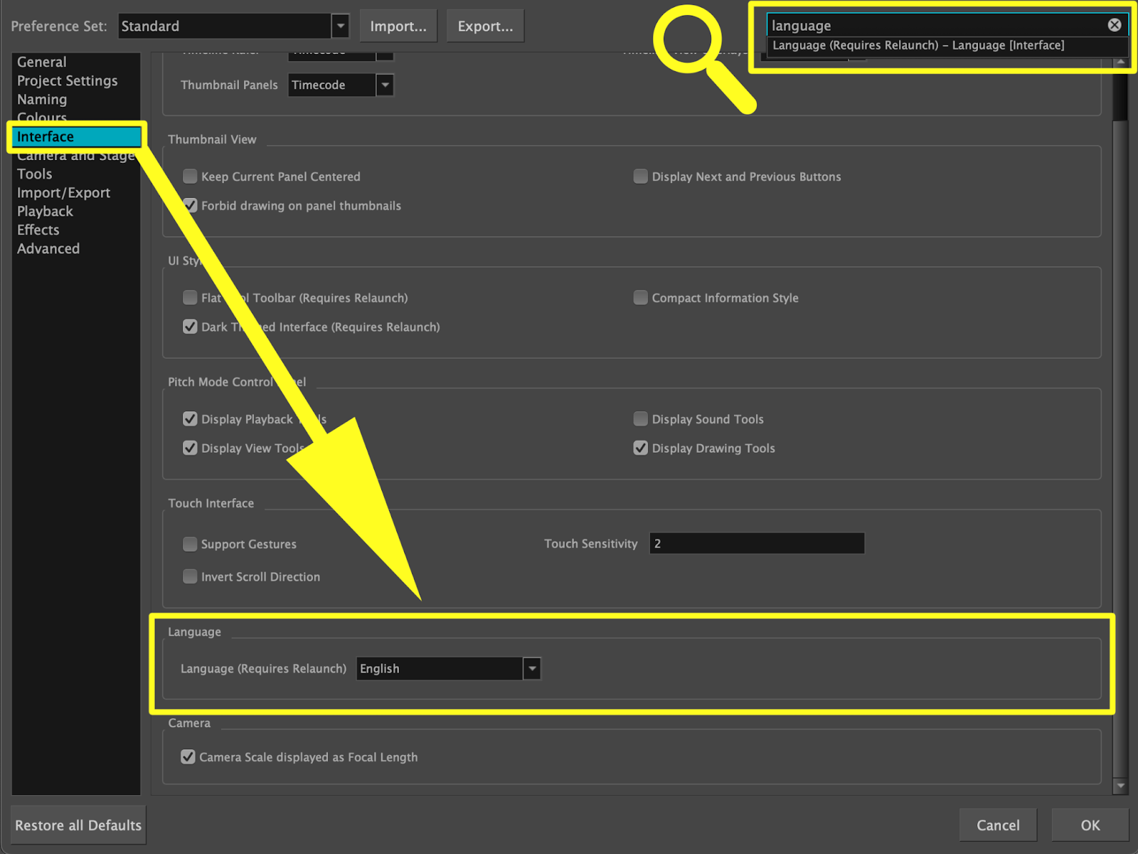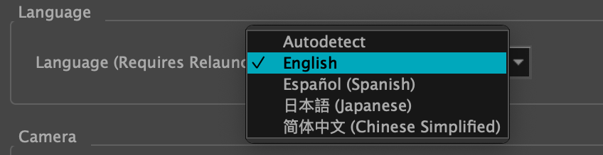 Par défaut, Storyboard Pro utilisera la langue de votre système d'exploitation ou vous permettra de choisir votre langue pendant le processus d'installation, mais vous pouvez également la modifier à tout moment via la fenêtre « Preferences ».