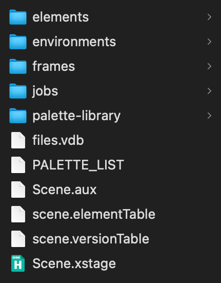 Un fichier .xstage est un format enregistré dans un dossier qui contient toutes les images, éléments, sons, palettes, etc. utilisés dans la scène. Le fichier .xstage lui-même est représenté par une icône de page Harmony. Lorsque ce fichier est ouvert, il référence tous les fichiers du dossier afin de charger la scène enregistrée.