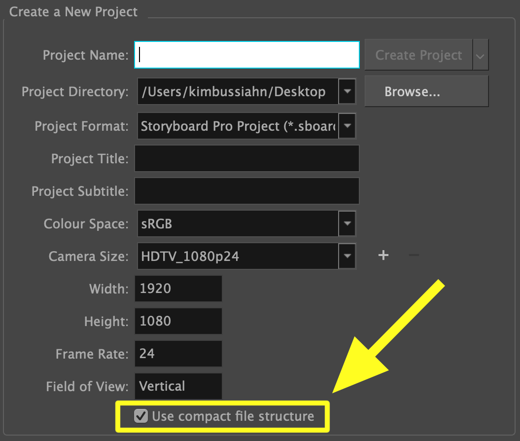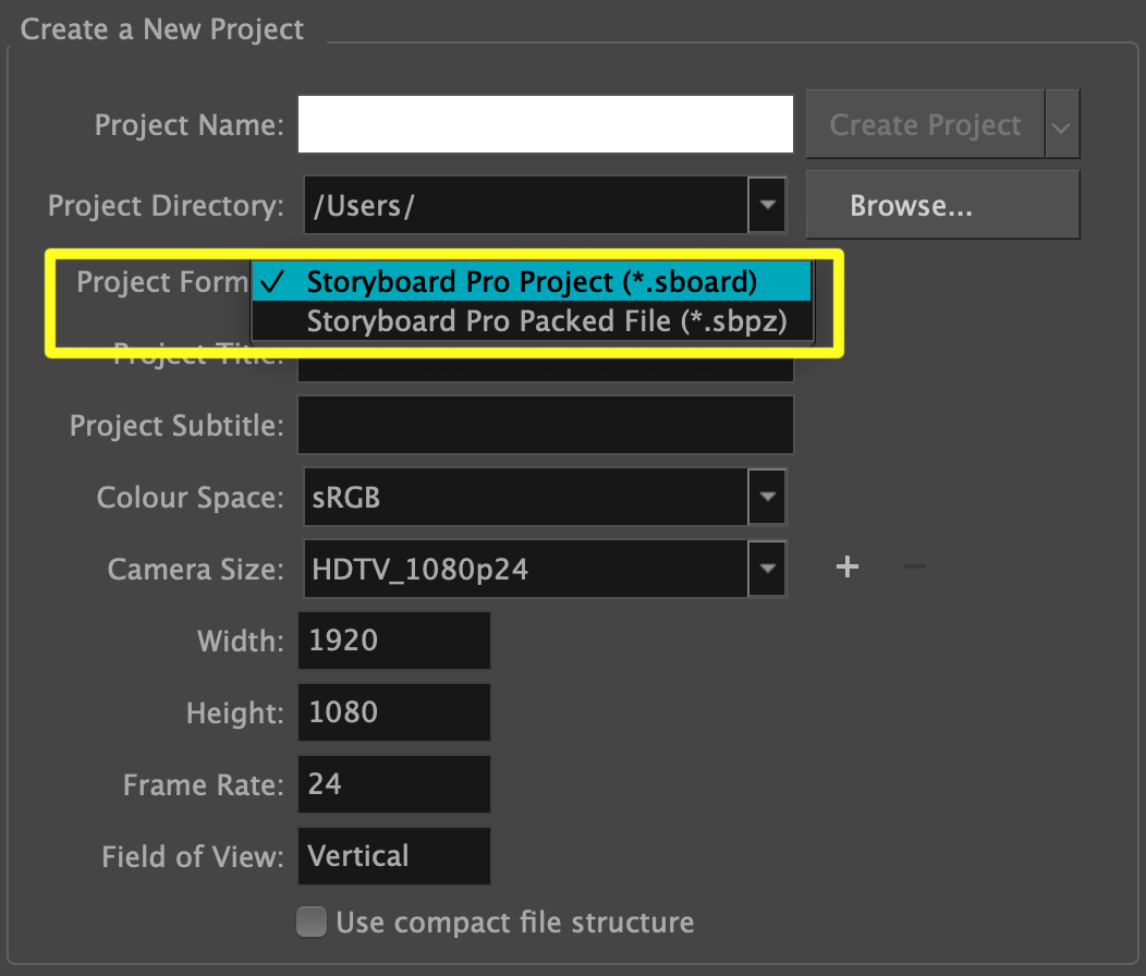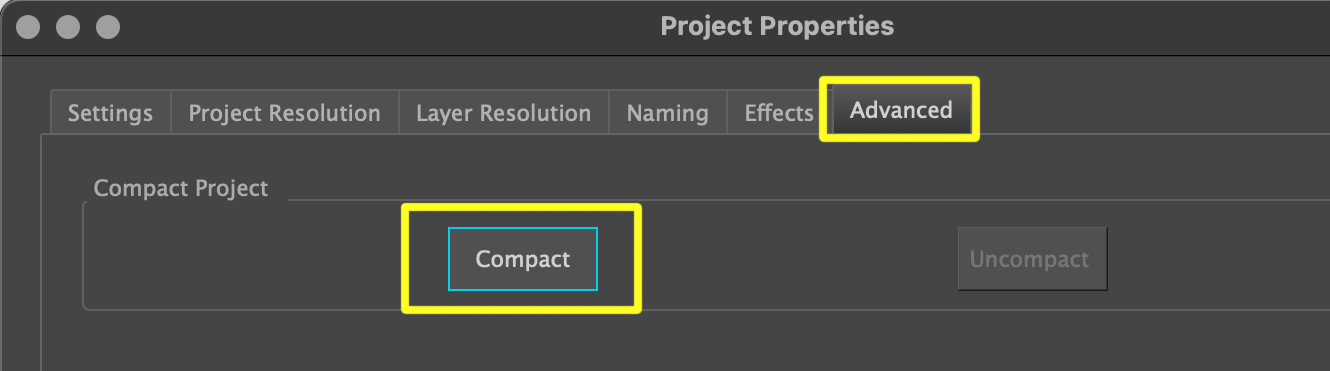 Vous pouvez convertir votre fichier en fichier compact en cochant la case « Compact File Structure » sur l'écran d'accueil lors de la création d'un nouveau projet, ou en allant dans Storyboard > Properties > Advanced tab et en choisissant Compact.