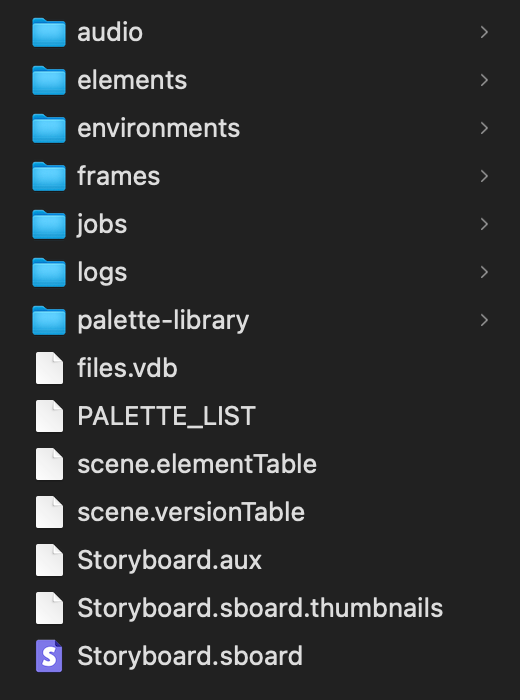 Un fichier .sboard est un format enregistré dans un dossier qui contient toutes les images, tous les éléments, tous les sons, toutes les palettes, etc. utilisés dans le projet. Le fichier .sboard lui-même est représenté par une icône de page Storyboard Pro. Lorsque ce fichier est ouvert, il référence tous les fichiers du dossier afin de charger le storyboard enregistré.