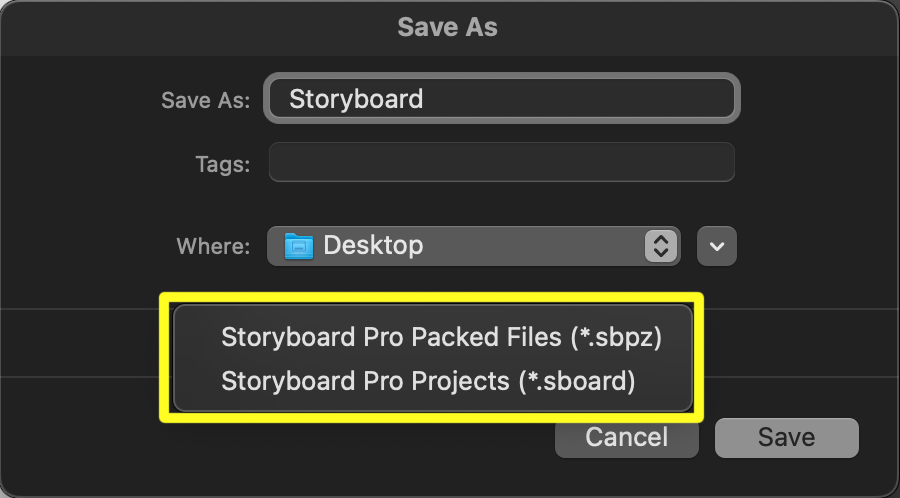 Storyboard Pro propose de nombreuses options d'enregistrement, chacune offrant des avantages différents en fonction de votre flux de travail. Les voici :