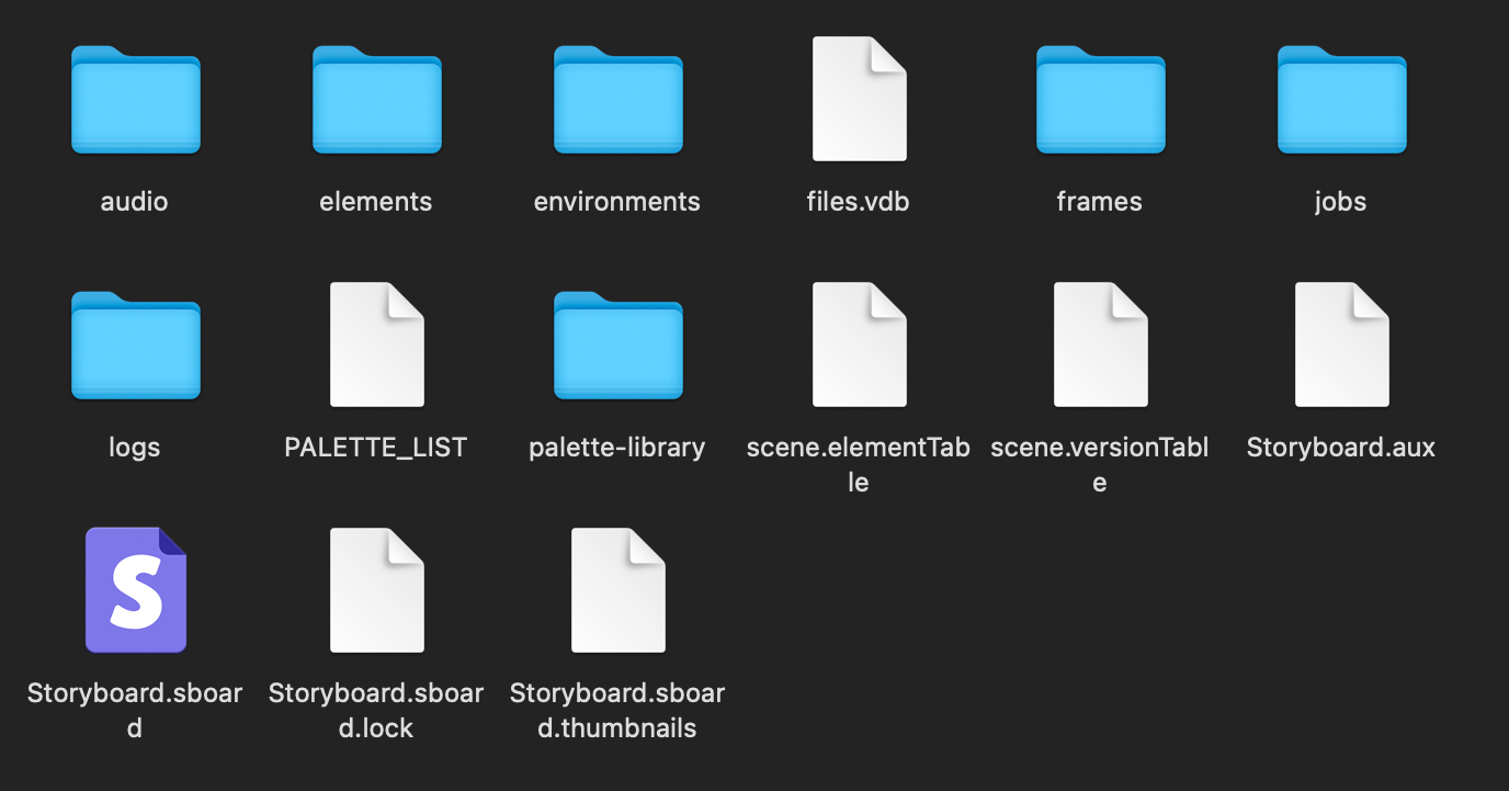 Les projets Harmony et Storyboard Pro sont composés de nombreux fichiers. Les éléments et les palettes ne sont pas intégrés au projet, ce sont des fichiers liés séparés.