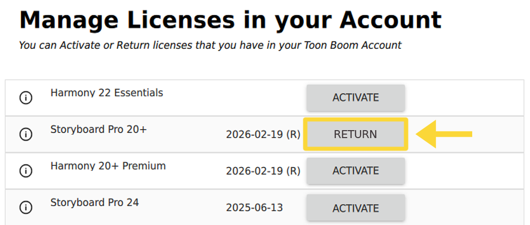 - Sur la page Gestion des licences, repérez la licence que vous souhaitez libérer et cliquez sur le bouton « Return ».