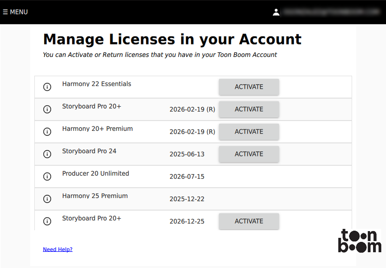 - L'assistant d'activation de Toon Boom apparaîtra :