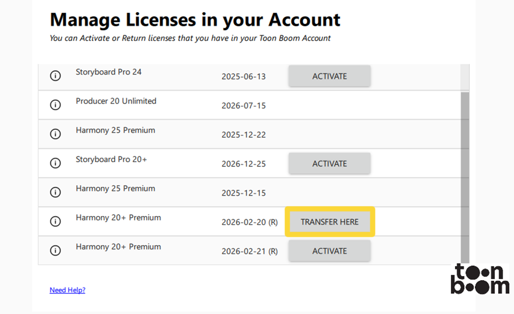| NOTE: Si vous rencontrez d'autres problèmes de licence, veuillez consulter l'article FAQ : Erreurs de licence, ou contacter Toon Boom : Comment puis-je contacter le service d'assistance de Toon Boom ? |