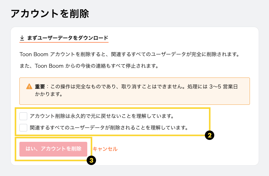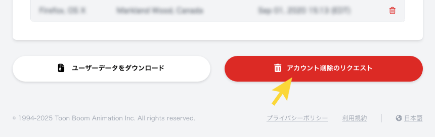 Toon Boom アカウントはいつでも削除できます。 以下の点にご注意ください: