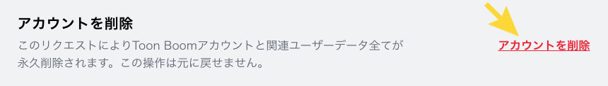 - Toon Boomアカウントにログインすると、ページ上部に削除依頼の通知バナーが表示されますので、アカウント削除のリクエストをキャンセルするボタンをクリックしてください。