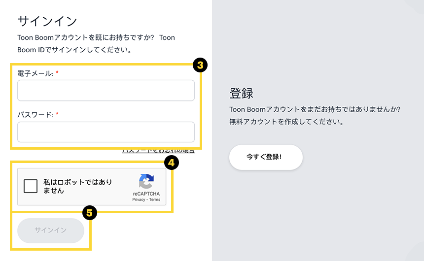 - 私はロボットではありません (reCAPTCHA)にチェックを入れ、ロボットでないことを確認する。