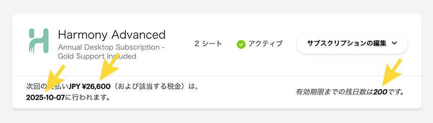- サブスクリプションパネルの下部には、次回の請求日、お支払い金額、現在の期間の残り日数が表示されます。
