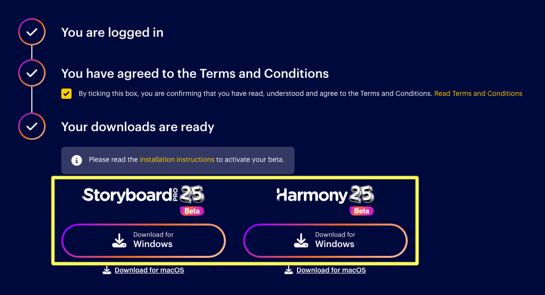 これで Toon Boom 25 Beta のインストールは完了です。 次のステップに進んでアクティベーションを行います。