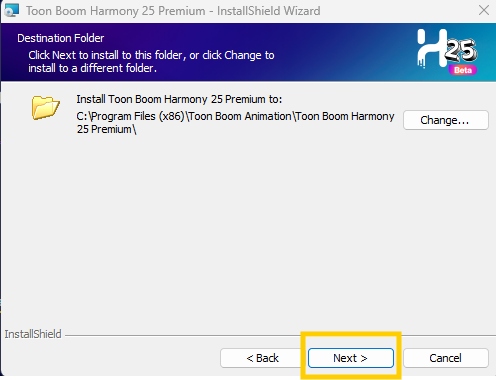 - Toon Boomソフトウェアのインストール場所を選択します。 場所を変更したい場合は、Changeをクリックして新しい場所を選択します。 準備ができたらNextをクリックします。