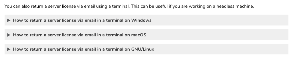 ターミナルで電子メールを使用してサーバーライセンスをアクティベートまたは返却する方法を教えてください。