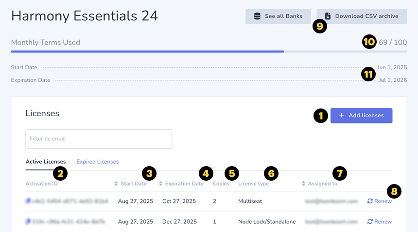 このページでは、どのユーザにライセンスが割り当てられているかを追跡し、開始日、有効期限、ライセンス タイプなどの主要な詳細を表示できます。 また、管理者はここで新しいライセンスを生成したり、既存のライセンスを更新したりできます。ここでは、以下の情報を見ることができます。