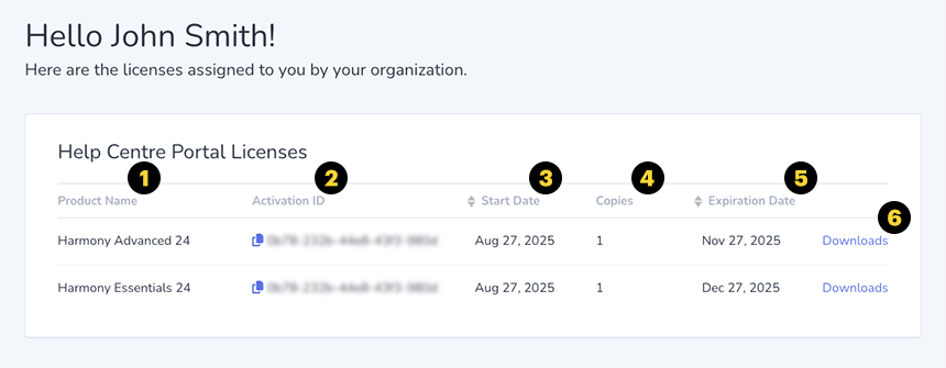 このページでは、管理者からあなたに割り当てられたすべてのライセンスを一覧表示します。以下の詳細が表示されます。