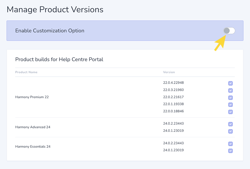 このページでは、Toon Boom 製品のどのビルドをチームで利用できるかを管理者が制御できます。 カスタマイズ オプションにより、必要に応じて特定のビルドへのアクセスを制限できます。