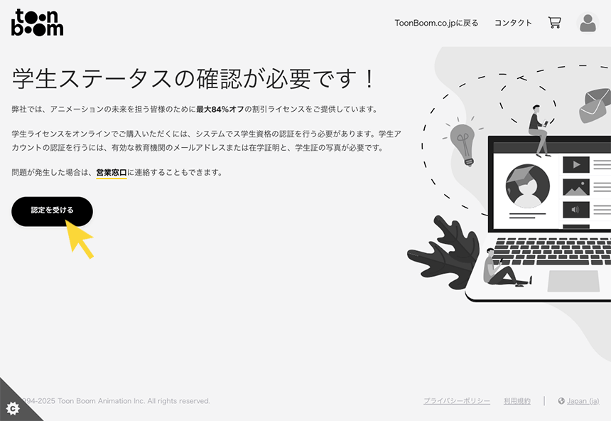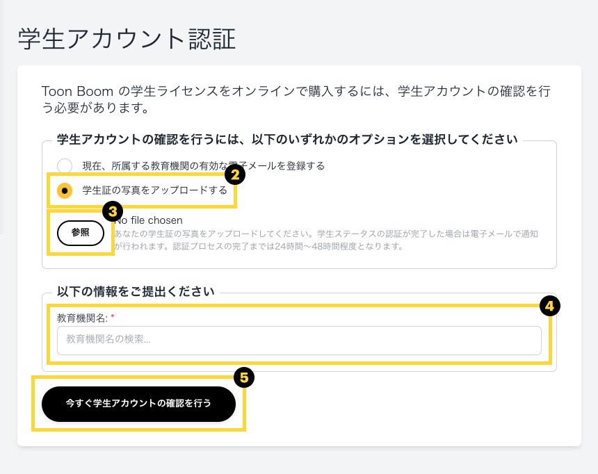 ノート: 学生IDは、Toon Boom営業チームが手動で確認する必要があります。 認証完了後、確認メールが送信されます。