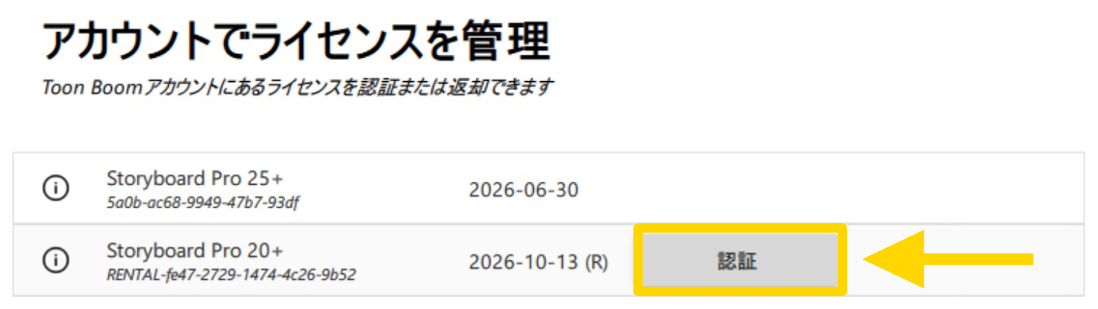 - アクティブ化するライセンスを見つけて、その横にある [認証] ボタンをクリックします。
